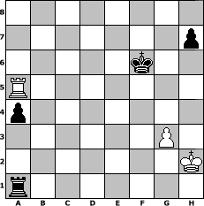 Partie-Notation im PGN-Format [Event "Neues Jahr 2010"] [Site "www.mySchach.de"] [Date "2010.01.01"] [Round "1"] [White "zidan"] [Black "Schefsche"] [ECO "A04"] [WhitemyELO "1450"] [BlackmyELO "1353"] [Result "1/2-1/2"] [TimeControl "10/3456000"] [WhiteDays "114"] [BlackDays "106"] [MySchachNr "61994"] 1. Nf3 Nc6 2. d4 d5 3. Bf4 Bg4 4. e3 Bxf3 5. Qxf3 Nf6 6. Nc3 e6 7. Bd3 Bb4 8. O-O Bxc3 9. bxc3 O-O 10. c4 Ne4 11. Bxe4 dxe4 12. Qxe4 a5 13. Rab1 Ra7 14. d5 exd5 15. cxd5 Nb4 16. a3 Nxd5 17. Be5 Re8 18. Rfd1 c6 19. Qd4 Ra8 20. Bxg7 Qg5 21. Bh8 f6 22. c4 Nxe3 23. fxe3 Kxh8 24. Re1 Rab8 25. h4 Qh6 26. Qa7 Qxh4 27. Re2 Qxc4 28. Rf2 Qd3 29. Rxb7 Ra8 30. Qb6 Rxe3 31. Qxc6 Qd4 32. Qxf6+ Qxf6 33. Rxf6 Rxa3 34. Rfb6 a4 35. Rb8+ Rxb8 36. Rxb8+ Kg7 37. Ra8 Kg6 38. Ra5 Ra1+ 39. Kh2 Kf6 40. g3 1/2-1/2 Stellungs-Notation im FEN-Format 8/7p/5k2/R7/p7/6P1/7K/r7 - - - 0 40 Geschlagene Figuren Weiss: Geschlagene Figuren Schwarz: Klicken Sie auf eine geschlagene Figur um den gewünschten Zug darzustellen!