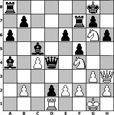 Partie-Notation im PGN-Format [Event "1.myschach- NoEngine-Cup."] [Site "www.mySchach.de"] [Date "2012.02.01"] [Round "1"] [White "Sanji"] [Black "Haneken"] [ECO "B20"] [WhitemyELO "1512"] [BlackmyELO "1566"] [Result "0-1"] [TimeControl "10/2592000"] [WhiteDays "30"] [BlackDays "23"] [MySchachNr "79579"] 1. e4 c5 2. d4 e6 3. Nf3 a6 4. a4 Nf6 5. e5 Nd5 6. c4 Nb4 7. Bd2 N8c6 8. Qb3 cxd4 9. Bd3 Nxd3+ 10. Qxd3 Bc5 11. O-O d6 12. exd6 Qxd6 13. Na3 Bd7 14. Nc2 O-O 15. Ng5 f5 16. Qh3 h6 17. Nf3 d3 18. Ne3 Nd4 19. Nh4 Nb3 20. Bc3 Nxa1 21. Ng6 Nb3 22. g3 Rf7 23. Ng2 Bxa4 24. N2f4 d2 25. Rd1 Nd4 26. Bxd4 Qxd4 0-1 Stellungs-Notation im FEN-Format r5k1/1p3rp1/p3p1Np/2b2p2/b1Pq1N2/6PQ/1P1pPP1P/3R2K1 - - - 0 27 Geschlagene Figuren Weiss: Geschlagene Figuren Schwarz: Klicken Sie auf eine geschlagene Figur um den gewünschten Zug darzustellen!