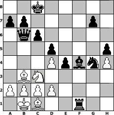 Partie-Notation im PGN-Format [Event "Hitzeschlacht"] [Site "www.mySchach.de"] [Date "2009.08.13"] [Round "1"] [White "Knight"] [Black "ChrisKoenig"] [ECO "A80"] [WhitemyELO "1179"] [BlackmyELO "1548"] [Result "0-1"] [TimeControl "10/864000"] [WhiteDays "10"] [BlackDays "10"] [MySchachNr "58278"] 1. d4 f5 2. Nc3 Nf6 3. e4 fxe4 4. f3 d5 5. Be3 Bf5 6. g4 Bg6 7. f4 h6 8. f5 Bf7 9. Bb5+ c6 10. Ba4 Nbd7 11. Qe2 Qb6 12. O-O-O e6 13. fxe6 Bxe6 14. h4 Bxg4 15. Qe1 Bxd1 16. Qxd1 Bd6 17. Nge2 O-O-O 18. Nf4 Rde8 19. Ng6 Rhg8 20. Kb1 h5 21. Rf1 Nf8 22. Nxf8 Rexf8 23. Bg5 Ng4 24. Rf7 Rxf7 25. Qg1 Rgf8 26. Bb3 Rf1+ 27. Qxf1 Rxf1+ 28. Bc1 Bf4 0-1 Stellungs-Notation im FEN-Format 2k5/pp4p1/1qp5/3p3p/3PpbnP/1BN5/PPPP4/1KB2r2 - - - 2 29 Geschlagene Figuren Weiss: Geschlagene Figuren Schwarz: Klicken Sie auf eine geschlagene Figur um den gewünschten Zug darzustellen!