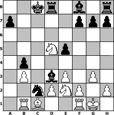 Partie-Notation im PGN-Format [Event "Wrixum - Open die XII"] [Site "www.mySchach.de"] [Date "2014.10.09"] [Round "1"] [White "sprinterde"] [Black "Helmut48"] [ECO "A25"] [WhitemyELO "1749"] [BlackmyELO "1973"] [Result "0-1"] [TimeControl "10/2592000"] [WhiteDays "58"] [BlackDays "58"] [MySchachNr "96281"] 1. c4 e5 2. Nc3 Nc6 3. e3 Nf6 4. g3 d5 5. cxd5 Nxd5 6. Bg2 Ndb4 7. Be4 Nd3+ 8. Bxd3 Qxd3 9. Qe2 Bf5 10. Qxd3 Bxd3 11. Nge2 Nb4 12. O-O Nc2 13. Rb1 b5 14. a3 c5 15. b3 b4 16. axb4 cxb4 17. Nd5 O-O-O 0-1 Stellungs-Notation im FEN-Format 2kr1b1r/p4ppp/8/3Np3/1p6/1P1bP1P1/2nPNP1P/1RB2RK1 - - - 2 18 Geschlagene Figuren Weiss: Geschlagene Figuren Schwarz: Klicken Sie auf eine geschlagene Figur um den gewünschten Zug darzustellen!