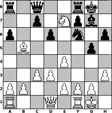 Partie-Notation im PGN-Format [Event "Wanderpokal November 2006"] [Site "www.mySchach.de"] [Date "2006.11.11"] [Round "1"] [White "Andylein1989"] [Black "Knight"] [ECO "C42"] [WhitemyELO "1442"] [BlackmyELO "1345"] [Result "1-0"] [TimeControl "10/864000"] [WhiteDays "08"] [BlackDays "10"] [MySchachNr "29977"] 1. e4 e5 2. Nf3 Nf6 3. Nc3 Nc6 4. Bc4 h6 5. O-O d6 6. d3 Bg4 7. h3 Bxf3 8. Qxf3 Nd4 9. Qd1 Qd7 10. Be3 b5 11. Bxd4 exd4 12. Nxb5 g5 13. Nxd4 Bg7 14. c3 O-O 15. Bb5 Qc8 16. Nc6 a6 17. Ne7+ 1-0 Stellungs-Notation im FEN-Format r1q2rk1/2p1Npb1/p2p1n1p/1B4p1/4P3/2PP3P/PP2PPP1/R2Q1RK1 - - - 1 17 Geschlagene Figuren Weiss: Geschlagene Figuren Schwarz: Klicken Sie auf eine geschlagene Figur um den gewünschten Zug darzustellen!