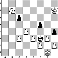 Partie-Notation im PGN-Format [Event "Herbstturnier"] [Site "www.mySchach.de"] [Date "2004.11.18"] [Round "1"] [White "Seneca"] [Black "Master1"] [ECO "D07"] [WhitemyELO "1619"] [BlackmyELO "1076"] [Result "1-0"] [TimeControl "10/864000"] [WhiteDays "40"] [BlackDays "40"] [MySchachNr "8190"] 1. d4 d5 2. c4 Nc6 3. e3 Nf6 4. Nc3 Ne4 5. Nxd5 e5 6. Nf3 Bd6 7. c5 Be7 8. Nxe7 Nxe7 9. Nxe5 O-O 10. Bd3 Bf5 11. O-O c6 12. Qc2 g6 13. Bxe4 Nd5 14. Bxf5 gxf5 15. Qxf5 Qf6 16. Qxf6 Nxf6 17. Bd2 Ne4 18. Bc3 Nxc3 19. bxc3 f6 20. Nc4 b5 21. cxb6 axb6 22. Nxb6 Ra6 23. Nd7 Rf7 24. Nc5 Ra8 25. a4 f5 26. g3 Re8 27. Rab1 Rd8 28. Rb7 Rdf8 29. Rxf7 Rxf7 30. Rb1 h6 31. Rb8+ Kg7 32. Rb7 Rxb7 33. Nxb7 Kf6 34. a5 Kg5 35. a6 h5 36. a7 Kg4 37. a8=Q h4 38. Qg8+ Kf3 39. Qh7 1-0 Stellungs-Notation im FEN-Format 8/1N5Q/2p5/5p2/3P3p/2P1PkP1/5P1P/6K1 - - - 3 39 Geschlagene Figuren Weiss: Geschlagene Figuren Schwarz: Klicken Sie auf eine geschlagene Figur um den gewünschten Zug darzustellen!