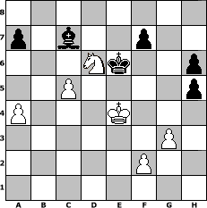 Partie-Notation im PGN-Format [Event "°°°°``Der sch"] [Site "www.mySchach.de"] [Date "2009.05.11"] [Round "1"] [White "Andylein1989"] [Black "ujack1961"] [ECO "C50"] [WhitemyELO "1587"] [BlackmyELO "1584"] [Result "1/2-1/2"] [TimeControl "10/864000"] [WhiteDays "39"] [BlackDays "50"] [MySchachNr "55574"] 1. e4 e5 2. Nf3 Nc6 3. Bc4 Nd4 4. Nxd4 exd4 5. c3 dxc3 6. dxc3 d6 7. Qd4 Nf6 8. Bg5 Be7 9. O-O O-O 10. Nd2 Be6 11. Nf3 c5 12. Qd3 Bxc4 13. Qxc4 Nxe4 14. Qxe4 Bxg5 15. Qxb7 Bf6 16. Rab1 Qb6 17. Qd5 Rae8 18. Rfd1 Re6 19. Nd2 Rfe8 20. Nc4 Qa6 21. a3 Be5 22. h3 h6 23. Rd3 Bf4 24. g3 Bg5 25. b3 Be7 26. Kg2 Rb8 27. Rb2 Qb7 28. Qxb7 Rxb7 29. b4 cxb4 30. Rxb4 Rd7 31. Rb8+ Kh7 32. Ne3 Bd8 33. Nd5 Re2 34. h4 Rc2 35. Kf3 Ra2 36. c4 Rc2 37. Rc3 Rxc3+ 38. Nxc3 Bb6 39. Nd5 Rd8 40. Rxd8 Bxd8 41. h5 g6 42. Nc3 gxh5 43. Nb5 Bb6 44. Nxd6 Kg6 45. Nb7 Kf6 46. a4 Ke7 47. c5 Bc7 48. Ke4 Ke6 49. Nd6 1/2-1/2 Stellungs-Notation im FEN-Format 8/p1b2p2/3Nk2p/2P4p/P3K3/6P1/5P2/8 - - - 4 49 Geschlagene Figuren Weiss: Geschlagene Figuren Schwarz: Klicken Sie auf eine geschlagene Figur um den gewünschten Zug darzustellen!