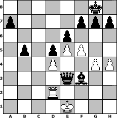 Partie-Notation im PGN-Format [Event "1.Schaltjahresturnier@mySchach"] [Site "www.mySchach.de"] [Date "2004.02.29"] [Round "1"] [White "Master1"] [Black "Naunhofer"] [ECO "D00"] [WhitemyELO "1165"] [BlackmyELO "1481"] [Result "0-1"] [TimeControl "10/1728000"] [WhiteDays "80"] [BlackDays "80"] [MySchachNr "2578"] 1. d4 d5 2. f4 Nf6 3. Nc3 Bf5 4. Nf3 e6 5. e3 Bb4 6. Bd2 Bxc3 7. Bxc3 O-O 8. Bd3 Ne4 9. Qe2 Nd7 10. O-O-O Qe7 11. Rde1 c5 12. h3 c4 13. Ne5 Nxe5 14. dxe5 cxd3 15. cxd3 Ng3 16. Qc2 Nxh1 17. Rxh1 Rac8 18. e4 Bg6 19. d4 Bxe4 20. Qd2 b5 21. Kd1 Qb7 22. Bb4 Rc2 23. Qe3 Rfc8 24. Bd2 Qa6 25. Ke2 Qxa2 26. b4 Rxd2+ 27. Qxd2 Rc2 28. Rd1 Rxd2+ 29. Rxd2 Qc4+ 30. Ke1 Qxb4 31. g4 Qc3 32. h4 Bf3 33. f5 Qe3+ 0-1 Stellungs-Notation im FEN-Format 6k1/p4ppp/4p3/1p1pPP2/3P2PP/4qb2/3R4/4K3 - - - 1 34 Geschlagene Figuren Weiss: Geschlagene Figuren Schwarz: Klicken Sie auf eine geschlagene Figur um den gewünschten Zug darzustellen!