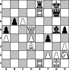 | Partie-Notation im PGN-Format [Event "1-2009"] [Site "www.mySchach.de"] [Date "2009.01.01"] [Round "1"] [White "Andreas"] [Black "steff"] [ECO "B07"] [WhitemyELO "1509"] [BlackmyELO "1207"] [Result "1-0"] [TimeControl "10/1728000"] [WhiteDays "66"] [BlackDays "78"] [MySchachNr "51233"] 1. e4 d6 2. d4 e6 3. Nf3 d5 4. e5 Nc6 5. c3 g6 6. Bd3 Bg7 7. O-O f6 8. Re1 f5 9. Bg5 Nge7 10. Na3 h6 11. Bxe7 Qxe7 12. Nc2 O-O 13. h3 b6 14. a4 Bd7 15. b4 a5 16. b5 Na7 17. c4 Qf7 18. cxd5 exd5 19. Rc1 Qe6 20. Ne3 c6 21. Qb3 f4 22. Ng4 h5 23. Ngh2 Bh6 24. Rc2 Qf7 25. e6 Bxe6 26. bxc6 Nc8 27. Ne5 Qg7 28. Nxg6 Re8 29. Rce2 Ne7 30. Rxe6 Ra7 31. Nxe7+ Raxe7 32. Qxd5 Bg5 33. Rxe7+ 1-0 Stellungs-Notation im FEN-Format 4r1k1/4R1q1/1pP5/p2Q2bp/P2P1p2/3B3P/5PPN/4R1K1 - - - 0 33 Geschlagene Figuren Weiss:                              Geschlagene Figuren Schwarz:                               Klicken Sie auf eine geschlagene Figur um den gewünschten Zug darzustellen!