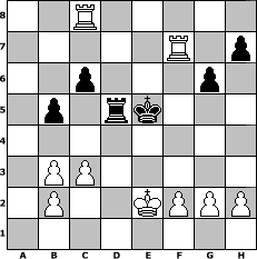 Partie-Notation im PGN-Format [Event "Herbst 2016"] [Site "www.mySchach.de"] [Date "2016.09.13"] [Round "1"] [White "miu"] [Black "Caligula"] [ECO "C62"] [WhitemyELO "1527"] [BlackmyELO "1351"] [Result "1-0"] [TimeControl "10/1728000"] [WhiteDays "77"] [BlackDays "68"] [MySchachNr "104886"] 1. e4 e5 2. Nf3 Nc6 3. Bb5 d6 4. O-O Bd7 5. c3 Nf6 6. Re1 a6 7. Ba4 b5 8. Bc2 Be7 9. d4 Na5 10. dxe5 dxe5 11. Nxe5 Be6 12. Qxd8+ Rxd8 13. Nd2 O-O 14. Nb3 Nxb3 15. axb3 Bd6 16. Nc6 Bc5 17. Nxd8 Rxd8 18. Bg5 Be7 19. e5 Nd5 20. Bxe7 Nxe7 21. Rxa6 Rd2 22. Ra8+ Nc8 23. Be4 g6 24. Bb7 Rd8 25. Kf1 Kf8 26. Bxc8 Bxc8 27. Ke2 c6 28. Rea1 Ke7 29. R1a7+ Ke6 30. Rc7 Kxe5 31. Raxc8 Rd5 32. Rxf7 1-0 Stellungs-Notation im FEN-Format 2R5/5R1p/2p3p1/1p1rk3/8/1PP5/1P2KPPP/8 - - - 0 32 Geschlagene Figuren Weiss: ![]() ![]() ![]() ![]() ![]() ![]() ![]() ![]() ![]() ![]() ![]() ![]() ![]() ![]() ![]() Geschlagene Figuren Schwarz: ![]() ![]() ![]() ![]() ![]() ![]() ![]() ![]() ![]() ![]() ![]() ![]() ![]() ![]() ![]() Klicken Sie auf eine geschlagene Figur um den gewünschten Zug darzustellen!