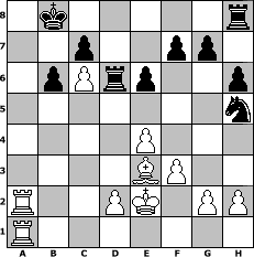 Partie-Notation im PGN-Format [Event "Wanderpokal November 2006"] [Site "www.mySchach.de"] [Date "2006.11.11"] [Round "1"] [White "cheldele"] [Black "Andylein1989"] [ECO "D06"] [WhitemyELO "1570"] [BlackmyELO "1442"] [Result "1-0"] [TimeControl "10/864000"] [WhiteDays "10"] [BlackDays "08"] [MySchachNr "29926"] 1. d4 d5 2. c4 Nf6 3. cxd5 Qxd5 4. Nc3 Qd8 5. e4 Nc6 6. Bc4 Qxd4 7. Qxd4 Nxd4 8. Kd1 e6 9. f3 Bb4 10. Nge2 Nxe2 11. Kxe2 Bxc3 12. bxc3 Bd7 13. Bf4 O-O-O 14. Rab1 Kb8 15. Rb2 h6 16. Rhb1 b6 17. Ba6 Bc6 18. c4 Bb7 19. Bxb7 Kxb7 20. c5 Nd7 21. Rc2 Nf6 22. c6+ Kb8 23. a4 Nh5 24. Be3 Rd6 25. a5 Kc8 26. axb6 axb6 27. Ra1 Kb8 28. Rca2 1-0 Stellungs-Notation im FEN-Format 1k5r/2p2pp1/1pPrp2p/7n/4P3/4BP2/R2PK1PP/R7 - - - 3 28 Geschlagene Figuren Weiss: Geschlagene Figuren Schwarz: Klicken Sie auf eine geschlagene Figur um den gewünschten Zug darzustellen!