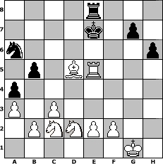 Partie-Notation im PGN-Format [Event "unter uns Nr. 41 (Advendturnier 2017)"] [Site "www.mySchach.de"] [Date "2017.11.29"] [Round "2"] [White "wolni55"] [Black "Haneken"] [ECO "C24"] [WhitemyELO "1398"] [BlackmyELO "1052"] [Result "1-0"] [TimeControl "10/864000"] [WhiteDays "34"] [BlackDays "35"] [MySchachNr "110547"] 1. e4 e5 2. Bc4 Nf6 3. d3 Bc5 4. Nf3 d6 5. h3 O-O 6. O-O a6 7. a3 b5 8. Ba2 h6 9. Re1 Nfd7 10. Be3 Qe7 11. Nbd2 Bxe3 12. Rxe3 a5 13. c3 a4 14. Re1 Nc5 15. d4 Nd3 16. Qc2 Nxe1 17. Rxe1 Qf6 18. dxe5 Qg6 19. exd6 Bxh3 20. g3 cxd6 21. Nd4 d5 22. exd5 Qxc2 23. Nxc2 Rd8 24. Re7 Kf8 25. Re4 Na6 26. g4 f5 27. gxf5 Bxf5 28. Rf4 Rxd5 29. Bxd5 Re8 30. Rxf5+ Ke7 31. Re5+ 1-0 Stellungs-Notation im FEN-Format 4r3/4k1p1/n6p/1p1BR3/p7/P1P5/1PNNPP2/6K1 - - - 2 31 Geschlagene Figuren Weiss: Geschlagene Figuren Schwarz: Klicken Sie auf eine geschlagene Figur um den gewünschten Zug darzustellen!
