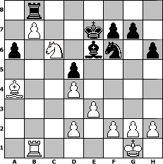 Partie-Notation im PGN-Format [Event "LASKER 2016/1916"] [Site "www.mySchach.de"] [Date "2016.10.26"] [Round "1"] [White "miu"] [Black "Joschi"] [ECO "D57"] [WhitemyELO "1550"] [BlackmyELO "1596"] [Result "1-0"] [TimeControl "10/2592000"] [WhiteDays "59"] [BlackDays "90"] [MySchachNr "105396"] 1. d4 d5 2. c4 e6 3. Nc3 Nf6 4. Bg5 Be7 5. e3 O-O 6. Nf3 h6 7. Bh4 Ne4 8. Bxe7 Qxe7 9. cxd5 Nxc3 10. bxc3 exd5 11. Rb1 Qa3 12. Qb3 Qxb3 13. axb3 Be6 14. Bd3 c6 15. O-O Nd7 16. c4 Nb6 17. c5 Nd7 18. b4 Rfb8 19. b5 cxb5 20. Bxb5 a6 21. Ba4 Nf6 22. Ne5 Kf8 23. Rb6 Ke7 24. Rfb1 Ra7 25. c6 Rc8 26. Rxb7+ Rxb7 27. cxb7 Rb8 28. Nc6+ 1-0 Stellungs-Notation im FEN-Format 1r6/1P2kpp1/p1N1bn1p/3p4/B2P4/4P3/3P1PPP/1R4K1 - - - 2 28 Geschlagene Figuren Weiss: Geschlagene Figuren Schwarz: Klicken Sie auf eine geschlagene Figur um den gewünschten Zug darzustellen!