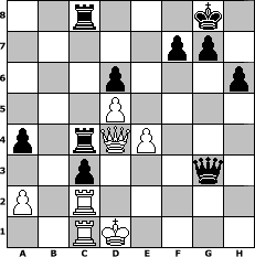 Partie-Notation im PGN-Format [Event "Neujahrsturnier 2007"] [Site "www.mySchach.de"] [Date "2007.01.01"] [Round "1"] [White "Andylein1989"] [Black "bernhard"] [ECO "C50"] [WhitemyELO "1406"] [BlackmyELO "1488"] [Result "0-1"] [TimeControl "10/864000"] [WhiteDays "47"] [BlackDays "47"] [MySchachNr "31305"] 1. e4 e5 2. Nf3 Nc6 3. Bc4 Bc5 4. d3 h6 5. O-O d6 6. h3 Na5 7. Nbd2 Nxc4 8. Nxc4 b6 9. Be3 Bxe3 10. Nxe3 c5 11. c3 Ne7 12. d4 exd4 13. cxd4 O-O 14. d5 Re8 15. Nd2 b5 16. f3 Qb6 17. Nb3 c4 18. Nd4 Ng6 19. Kh1 Nf4 20. Nec2 a5 21. Na3 Bd7 22. Qd2 Nd3 23. Ne2 Rac8 24. Nc1 Ne5 25. Ne2 Rc7 26. Qd4 Qb7 27. Rab1 Rec8 28. Rfc1 Rc5 29. b3 Qc7 30. bxc4 bxc4 31. Nc3 a4 32. Ncb5 Bxb5 33. Nxb5 Qd7 34. Na3 Nxf3 35. gxf3 Qxh3+ 36. Kg1 Qg3+ 37. Kf1 Qxf3+ 38. Ke1 Qxa3 39. Rb2 Qg3+ 40. Kd1 c3 41. Rbc2 Rc4 0-1 Stellungs-Notation im FEN-Format 2r3k1/5pp1/3p3p/3P4/p1rQP3/2p3q1/P1R5/2RK4 - - - 2 42 Geschlagene Figuren Weiss: Geschlagene Figuren Schwarz: Klicken Sie auf eine geschlagene Figur um den gewünschten Zug darzustellen!