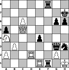Partie-Notation im PGN-Format [Event "Fernschachmeisterschaft Sfr. Heimersheim 2005"] [Site "www.mySchach.de"] [Date "2005.08.06"] [Round "2"] [White "Press@"] [Black "paula"] [ECO "B32"] [WhitemyELO "1500"] [BlackmyELO "1722"] [Result "0-1"] [TimeControl "10/2592000"] [WhiteDays "87"] [BlackDays "62"] [MySchachNr "15957"] 1. e4 c5 2. Nf3 Nc6 3. d4 cxd4 4. Nxd4 a6 5. Bc4 g6 6. O-O Nf6 7. Nxc6 bxc6 8. Nc3 Qc7 9. Qe2 d6 10. Bg5 Bg7 11. h3 O-O 12. Rad1 a5 13. Rfe1 e5 14. b3 Be6 15. Qf1 h6 16. Bxe6 fxe6 17. Bc1 Rad8 18. Ba3 Rf7 19. Na4 Bf8 20. c4 d5 21. Bxf8 Rdxf8 22. exd5 exd5 23. Qd3 Kh7 24. Qg3 Ne4 25. Qe3 Nxf2 26. Rd2 e4 27. cxd5 Rf3 28. Qc5 Qg3 29. dxc6 Nxh3+ 30. Kh1 Rf1+ 0-1 Stellungs-Notation im FEN-Format 5r2/7k/2P3pp/p1Q5/N3p3/1P4qn/P2R2P1/4Rr1K - - - 2 31 Geschlagene Figuren Weiss: ![]() ![]() ![]() ![]() ![]() ![]() ![]() ![]() ![]() ![]() ![]() ![]() ![]() ![]() ![]() Geschlagene Figuren Schwarz: ![]() ![]() ![]() ![]() ![]() ![]() ![]() ![]() ![]() ![]() ![]() ![]() ![]() ![]() ![]() Klicken Sie auf eine geschlagene Figur um den gewünschten Zug darzustellen!