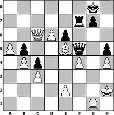 Partie-Notation im PGN-Format [Event "Und wieder Aljechin...."] [Site "www.mySchach.de"] [Date "2011.06.17"] [Round "1"] [White "Haki"] [Black "reisinger"] [ECO "B02"] [WhitemyELO "1290"] [BlackmyELO "1516"] [Result "1-0"] [TimeControl "10/2592000"] [WhiteDays "150"] [BlackDays "150"] [MySchachNr "74618"] 1. e4 Nf6 2. Nc3 d5 3. e5 Nfd7 4. d4 e6 5. f4 c5 6. Nf3 Nc6 7. Be3 Qb6 8. Na4 Qb4+ 9. c3 Qa5 10. g3 Nb6 11. Nxc5 Bxc5 12. dxc5 Nc4 13. Bxc4 dxc4 14. O-O O-O 15. Nd2 Qb5 16. Qc2 b6 17. cxb6 axb6 18. Nf3 h6 19. a4 Qa6 20. b4 Qb7 21. Nd2 b5 22. a5 Rd8 23. Ne4 Rd3 24. Nd6 Qd7 25. Bc5 Ba6 26. Rad1 Rxd1 27. Rxd1 Rd8 28. h4 Ne7 29. g4 Nc8 30. g5 h5 31. g6 Nxd6 32. exd6 Bb7 33. Ra1 Qc6 34. gxf7+ Kxf7 35. Kh2 Qf3 36. Qd2 Qg4 37. Qf2 Kg8 38. Rg1 Qf5 39. Bd4 Rd7 40. Be5 Bf3 41. Qxf3 Rf7 42. Qc6 1-0 Stellungs-Notation im FEN-Format 6k1/5rp1/2QPp3/Pp2Bq1p/1Pp2P1P/2P5/4P2K/6R1 - - - 2 42 Geschlagene Figuren Weiss: Geschlagene Figuren Schwarz: Klicken Sie auf eine geschlagene Figur um den gewünschten Zug darzustellen!