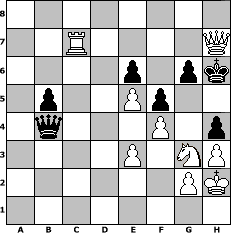 Partie-Notation im PGN-Format [Event "Prätorianer"] [Site "www.mySchach.de"] [Date "2023.01.04"] [Round "1"] [White "beowulf"] [Black "Achimkogge"] [ECO "A03"] [WhitemyELO "1407"] [BlackmyELO "1307"] [Result "1-0"] [TimeControl "10/1728000"] [WhiteDays "20"] [BlackDays "20"] [MySchachNr "128885"] 1. f4 d5 2. Nf3 Nc6 3. b3 Bf5 4. Bb2 Nf6 5. e3 Bg4 6. h3 Bh5 7. Bb5 a6 8. Be2 Ne4 9. O-O Ng3 10. Re1 e6 11. Kh2 Ne4 12. d4 Nf2 13. Qc1 f6 14. Nbd2 h6 15. c4 f5 16. Ne5 Nxe5 17. dxe5 Bxe2 18. Rxe2 Nd3 19. Qc2 Nxb2 20. Qxb2 Bc5 21. cxd5 Qxd5 22. Nf1 O-O 23. Rd2 Qc6 24. Rad1 Bb4 25. Rd7 a5 26. a3 Bc3 27. Qc1 b5 28. b4 axb4 29. axb4 Ra2 30. R7d2 Rxd2 31. Rxd2 Kh7 32. Rc2 Qc4 33. Rxc3 Qxb4 34. Rxc7 h5 35. Qd1 Kh6 36. Ng3 g6 37. Qd7 Rf7 38. Qxf7 h4 39. Qh7# 1-0 Stellungs-Notation im FEN-Format 8/2R4Q/4p1pk/1p2Pp2/1q3P1p/4P1NP/6PK/8 - - - 1 39 Geschlagene Figuren Weiss: Geschlagene Figuren Schwarz: Klicken Sie auf eine geschlagene Figur um den gewünschten Zug darzustellen!