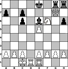 Partie-Notation im PGN-Format [Event "Dabei ist alles 6"] [Site "www.mySchach.de"] [Date "2009.03.21"] [Round "1"] [White "Naunhofer"] [Black "gunni50"] [ECO "C57"] [WhitemyELO "1559"] [BlackmyELO "1308"] [Result "1-0"] [TimeControl "10/864000"] [WhiteDays "10"] [BlackDays "10"] [MySchachNr "54083"] 1. e4 e5 2. Nf3 Nc6 3. Bc4 Nf6 4. Ng5 d5 5. exd5 Nxd5 6. Nxf7 Kxf7 7. Qf3+ Qf6 8. Bxd5+ Ke7 9. Qg3 Be6 10. Bxc6 bxc6 11. d3 g6 12. Bg5 Bg7 13. Bxf6+ Bxf6 14. Nc3 Rae8 15. O-O-O Bf7 16. Rhe1 Bg5+ 17. Qxg5+ Kd7 18. d4 h6 19. Qg4+ Be6 20. dxe5+ Ke7 21. Qxg6 Ref8 22. Qg7+ Ke8 23. Ne4 Rfg8 24. Nf6# 1-0 Stellungs-Notation im FEN-Format 4k1rr/p1p3Q1/2p1bN1p/4P3/8/8/PPP1PPPP/2KRR3 - - - 6 24 Geschlagene Figuren Weiss: Geschlagene Figuren Schwarz: Klicken Sie auf eine geschlagene Figur um den gewünschten Zug darzustellen!