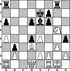 Partie-Notation im PGN-Format [Event "Schach dem Nikolaus VII"] [Site "www.mySchach.de"] [Date "2020.11.23"] [Round "1"] [White "Ziegert"] [Black "martinus"] [ECO "B32"] [WhitemyELO "2104"] [BlackmyELO "1689"] [Result "1-0"] [TimeControl "10/2592000"] [WhiteDays "24"] [BlackDays "30"] [MySchachNr "119940"] 1. e4 c5 2. Nf3 Nc6 3. d4 cxd4 4. Nxd4 e5 5. Nb5 d6 6. N1c3 a6 7. Na3 Nf6 8. Bg5 Be7 9. Nc4 b5 10. Bxf6 gxf6 11. Ne3 Qa5 12. a4 b4 13. Ncd5 b3+ 14. c3 Nd4 15. Nxe7 Kxe7 16. Nc4 Qc5 17. cxd4 exd4 18. Bd3 Be6 19. Nd2 Rhg8 20. O-O Qg5 21. g3 h5 22. Nf3 h4 23. Nxg5 1-0 Stellungs-Notation im FEN-Format r5r1/4kp2/p2pbp2/6N1/P2pP2p/1p1B2P1/1P2PP1P/R2Q1RK1 - - - 0 23 Geschlagene Figuren Weiss: Geschlagene Figuren Schwarz: Klicken Sie auf eine geschlagene Figur um den gewünschten Zug darzustellen!