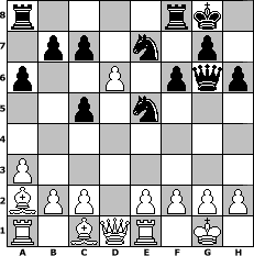 Partie-Notation im PGN-Format [Event ""Gewinne mit Schottisch""] [Site "www.mySchach.de"] [Date "2010.07.11"] [Round "1"] [White "Matti"] [Black "Andylein1989"] [ECO "C21"] [WhitemyELO "1536"] [BlackmyELO "1618"] [Result "1-0"] [TimeControl "10/1728000"] [WhiteDays "09"] [BlackDays "19"] [MySchachNr "66891"] 1. e4 e5 2. d4 exd4 3. Nf3 Nc6 4. Bc4 h6 5. Nxd4 Bc5 6. Nf5 Qf6 7. O-O Nge7 8. Ng3 O-O 9. Nc3 d6 10. a3 a6 11. Ba2 Be6 12. Nd5 Bxd5 13. exd5 Ne5 14. Ne4 Qg6 15. Nxc5 dxc5 16. Re1 f6 17. d6+ 1-0 Stellungs-Notation im FEN-Format r4rk1/1pp1n1p1/p2P1pqp/2p1n3/8/P7/BPP1PPPP/R1BQR1K1 - - - 0 17 Geschlagene Figuren Weiss: Geschlagene Figuren Schwarz: Klicken Sie auf eine geschlagene Figur um den gewünschten Zug darzustellen!