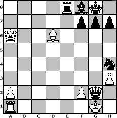 Partie-Notation im PGN-Format [Event "7er2"] [Site "www.mySchach.de"] [Date "2015.11.13"] [Round "1"] [White "Joschi"] [Black "Steffi"] [ECO "C66"] [WhitemyELO "1614"] [BlackmyELO "1517"] [Result "0-1"] [TimeControl "10/3456000"] [WhiteDays "160"] [BlackDays "140"] [MySchachNr "101220"] 1. e4 e5 2. Nf3 Nc6 3. Bb5 Nf6 4. O-O d6 5. Re1 Be7 6. c3 O-O 7. h3 a6 8. Ba4 b5 9. Bb3 Bb7 10. d4 exd4 11. cxd4 Re8 12. Nc3 Na5 13. Bc2 b4 14. Nb1 Rb8 15. b3 c5 16. Nbd2 Bf8 17. Bb2 Qc7 18. Nf1 c4 19. bxc4 Nxc4 20. Bc1 Nxe4 21. N1d2 Nc3 22. Rxe8 Rxe8 23. Qf1 Ne2+ 24. Kh1 Nxd2 25. Bxd2 Qxc2 26. Bxb4 Bxf3 27. gxf3 Nxd4 28. Kg2 Qg6+ 29. Kh1 Nxf3 30. Qxa6 Qe4 31. Bxd6 Nh4+ 32. Kg1 Qg2# 0-1 Stellungs-Notation im FEN-Format 4rbk1/5ppp/Q2B4/8/7n/7P/P4Pq1/R5K1 - - - 3 33 Geschlagene Figuren Weiss: Geschlagene Figuren Schwarz: Klicken Sie auf eine geschlagene Figur um den gewünschten Zug darzustellen!