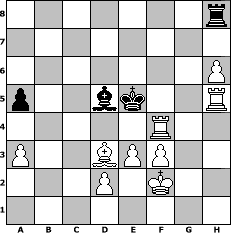 Partie-Notation im PGN-Format [Event "Neues Jahr 2020"] [Site "www.mySchach.de"] [Date "2020.01.01"] [Round "1"] [White "Seneca"] [Black "miu"] [ECO "A45"] [WhitemyELO "1570"] [BlackmyELO "1526"] [Result "1-0"] [TimeControl "10/2592000"] [WhiteDays "29"] [BlackDays "30"] [MySchachNr "116760"] 1. d4 Nf6 2. e3 e6 3. c4 b6 4. Nc3 Bb7 5. Nf3 Bb4 6. a3 Bxc3+ 7. bxc3 d5 8. cxd5 exd5 9. Be2 O-O 10. O-O Re8 11. Bb2 Nbd7 12. c4 Ne4 13. cxd5 Bxd5 14. Rc1 Ndf6 15. Qc2 Rc8 16. Bc4 Bb7 17. Ne5 c5 18. Nxf7 Qe7 19. Nd6+ Kh8 20. Nxc8 Rxc8 21. Qd3 h5 22. dxc5 Nxc5 23. Qg6 Be4 24. Bxf6 Qxf6 25. Qxh5+ Qh6 26. Qxh6+ gxh6 27. Bb5 Rd8 28. Rcd1 Rg8 29. f3 Bb7 30. Rd6 a6 31. Bc4 Rc8 32. Rxh6+ Kg7 33. Rxb6 Rc7 34. Rd1 Na4 35. Rb4 Nc5 36. Be2 Ne6 37. Kf2 Kf7 38. h4 Ng7 39. Rf4+ Ke6 40. g4 Ke5 41. h5 Nxh5 42. gxh5 Rh7 43. Rh1 a5 44. h6 Bd5 45. Bd3 Rh8 46. Rh5+ 1-0 Stellungs-Notation im FEN-Format 7r/8/7P/p2bk2R/5R2/P2BPP2/3P1K2/8 - - - 4 46 Geschlagene Figuren Weiss: Geschlagene Figuren Schwarz: Klicken Sie auf eine geschlagene Figur um den gewünschten Zug darzustellen!