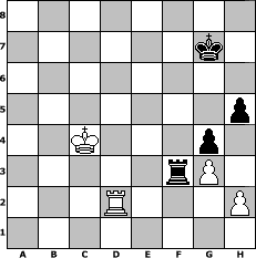 Partie-Notation im PGN-Format [Event "Pfingsturnier"] [Site "www.mySchach.de"] [Date "2019.05.31"] [Round "2"] [White "pepo47"] [Black "Erich"] [ECO "B92"] [WhitemyELO "2125"] [BlackmyELO "2072"] [Result "1/2-1/2"] [TimeControl "10/2592000"] [WhiteDays "171"] [BlackDays "164"] [MySchachNr "115148"] 1. e4 c5 2. Nf3 d6 3. d4 cxd4 4. Nxd4 Nf6 5. Nc3 a6 6. Be2 e5 7. Nb3 Be7 8. O-O O-O 9. Be3 Be6 10. f4 exf4 11. Bxf4 Nc6 12. Kh1 d5 13. e5 Ne4 14. Bd3 f5 15. exf6 Bxf6 16. Nxe4 dxe4 17. Bxe4 Qxd1 18. Raxd1 Bxb2 19. g3 Ba3 20. Rfe1 Bf7 21. Rd7 Rfe8 22. Kg2 Rad8 23. Rxd8 Nxd8 24. Kf2 b5 25. Bc1 Bd6 26. Bf4 Bf8 27. Re2 h6 28. Bc1 Bb4 29. a3 Bd6 30. Ke1 Ne6 31. Bb2 Rb8 32. Bf5 Nc5 33. Nxc5 Bxc5 34. Re5 Bf8 35. Bd3 g5 36. Rf5 Rb6 37. Kd2 Rc6 38. Be4 Rd6+ 39. Bd3 Bg6 40. Rf2 Bg7 41. Bxg7 Kxg7 42. Kc3 Bxd3 43. cxd3 Rc6+ 44. Kb4 g4 45. Ka5 Rc3 46. Ra2 Rxd3 47. Kxa6 Rb3 48. Rd2 h5 49. Ka5 Rxa3+ 50. Kxb5 Rf3 51. Kc4 1/2-1/2 Stellungs-Notation im FEN-Format 8/6k1/8/7p/2K3p1/5rP1/3R3P/8 - - - 2 51 Geschlagene Figuren Weiss: Geschlagene Figuren Schwarz: Klicken Sie auf eine geschlagene Figur um den gewünschten Zug darzustellen!