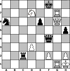Partie-Notation im PGN-Format [Event "960 Chess Fun"] [Site "www.mySchach.de"] [Date "2006.03.14"] [Round "1"] [White "bane"] [Black "crca108"] [Variant "Fischerrandom"] [SetUp "1"] [FEN "nrnqkrbb/pppppppp/8/8/8/8/PPPPPPPP/NRNQKRBB w KQkq - 0 1"] [WhitemyELO "1905"] [BlackmyELO "1408"] [Result "1-0"] [TimeControl "10/864000"] [WhiteDays "10"] [BlackDays "10"] [MySchachNr "23588"] 1. f4 f5 2. Bd4 Nd6 3. Bxa7 Rc8 4. g3 b6 5. a4 c5 6. a5 bxa5 7. Bxa8 Rxa8 8. Bxc5 Ne4 9. Nd3 a4 10. e3 g6 11. Bd4 Bc4 12. Bxh8 Rxh8 13. b3 axb3 14. Nxb3 e6 15. Rg1 h6 16. Ne5 Bxb3 17. Rxb3 Rg8 18. Kf1 Qc7 19. d3 Nc5 20. Rb4 Ra2 21. g4 Na6 22. Rc4 Qb6 23. Rc8+ Ke7 24. Rxg8 Qxe3 25. Kg2 fxg4 26. Rg7+ Kf8 27. Qxg4 Rxc2+ 28. Kh1 h5 29. Qxg6 Qxf4 30. Nxd7# 1-0 Stellungs-Notation im FEN-Format 5k2/3N2R1/n3p1Q1/7p/5q2/3P4/2r2P1P/6RK - - - 0 30 Geschlagene Figuren Weiss: Geschlagene Figuren Schwarz: Klicken Sie auf eine geschlagene Figur um den gewünschten Zug darzustellen!