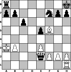 Partie-Notation im PGN-Format [Event "Verschachert # 4"] [Site "www.mySchach.de"] [Date "2013.05.12"] [Round "1"] [White "Hobbykegler"] [Black "borsti"] [ECO "A10"] [WhitemyELO "1090"] [BlackmyELO "1284"] [Result "0-1"] [TimeControl "10/1728000"] [WhiteDays "51"] [BlackDays "56"] [MySchachNr "88300"] 1. c4 d5 2. b3 Nc6 3. Bb2 f6 4. cxd5 Qxd5 5. Nc3 Qd8 6. Qc2 Nh6 7. Ne4 Bf5 8. O-O-O Nb4 9. Qc4 e5 10. Ba3 Nxa2+ 11. Kb2 Bxa3+ 12. Kxa3 Bxe4 13. Qxe4 Qd6+ 14. Kxa2 c6 15. e3 O-O 16. Bc4+ Kh8 17. Bd3 f5 18. Qc4 Rfd8 19. Qf7 Nxf7 20. Bxf5 Qb4 21. Ne2 Rxd2+ 22. Rxd2 Qxd2+ 23. Ka3 Qxe2 0-1 Stellungs-Notation im FEN-Format r6k/pp3npp/2p5/4pB2/8/KP2P3/4qPPP/7R - - - 0 24 Geschlagene Figuren Weiss: Geschlagene Figuren Schwarz: Klicken Sie auf eine geschlagene Figur um den gewünschten Zug darzustellen!