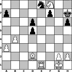 Partie-Notation im PGN-Format [Event "Gegen die Herbstdepression"] [Site "www.mySchach.de"] [Date "2008.12.01"] [Round "2"] [White "ujack1961"] [Black "Helmut48"] [ECO "C40"] [WhitemyELO "1622"] [BlackmyELO "1394"] [Result "1-0"] [TimeControl "10/864000"] [WhiteDays "10"] [BlackDays "10"] [MySchachNr "50382"] 1. e4 e5 2. Nf3 Qf6 3. Nc3 c6 4. Be2 h6 5. O-O b5 6. a3 Qd6 7. d4 exd4 8. e5 Qc5 9. Nb1 g5 10. b4 Qd5 11. Qxd4 Qxd4 12. Nxd4 Bg7 13. f4 gxf4 14. Bxf4 Ne7 15. Nd2 O-O 16. N2f3 Nd5 17. Bd2 Na6 18. c4 bxc4 19. Bxc4 Bb7 20. Bxd5 cxd5 21. Nf5 Kh7 22. Nxg7 Kxg7 23. Nd4 Rae8 24. Nf5+ Kh7 25. Nd6 Rxe5 26. Nxb7 Re6 27. Rae1 Nc7 28. Nc5 Rxe1 29. Rxe1 d6 30. Nd7 Ne8 31. Nxf8+ 1-0 Stellungs-Notation im FEN-Format 4nN2/p4p1k/3p3p/3p4/1P6/P7/3B2PP/4R1K1 - - - 0 31 Geschlagene Figuren Weiss: ![]() ![]() ![]() ![]() ![]() ![]() ![]() ![]() ![]() ![]() ![]() ![]() ![]() ![]() ![]() Geschlagene Figuren Schwarz: ![]() ![]() ![]() ![]() ![]() ![]() ![]() ![]() ![]() ![]() ![]() ![]() ![]() ![]() ![]() Klicken Sie auf eine geschlagene Figur um den gewünschten Zug darzustellen!