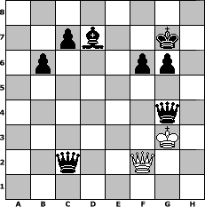Partie-Notation im PGN-Format [Event "FREUNDESTUNIER"] [Site "www.mySchach.de"] [Date "2005.10.28"] [Round "2"] [White "icke"] [Black "Seneca"] [ECO "C26"] [WhitemyELO "1343"] [BlackmyELO "1734"] [Result "0-1"] [TimeControl "10/864000"] [WhiteDays "59"] [BlackDays "50"] [MySchachNr "19018"] 1. e4 e5 2. Nc3 Nf6 3. Bd3 Nc6 4. Nf3 Bc5 5. O-O O-O 6. Na4 Be7 7. Qe2 d6 8. h3 Bd7 9. Nc3 a6 10. Ng5 Nb4 11. a3 Nxd3 12. Qxd3 b6 13. Nd5 Nxd5 14. exd5 Bxg5 15. Re1 g6 16. Qf3 Qc8 17. d3 Bxc1 18. Raxc1 Rb8 19. d4 exd4 20. Re7 Qd8 21. Rce1 Be6 22. Qf6 Bxd5 23. Qg5 Be6 24. h4 Re8 25. Rxe8+ Qxe8 26. Qf6 Qf8 27. h5 Re8 28. hxg6 hxg6 29. c3 dxc3 30. bxc3 Bc4 31. Re3 Rxe3 32. fxe3 d5 33. Qc6 Qe7 34. Qa8+ Kg7 35. Qc6 Qxe3+ 36. Kh2 Qe5+ 37. g3 Bb5 38. Qa8 Qxc3 39. Qc8 d4 40. a4 Bxa4 41. Qxa6 Qc2+ 42. Kh3 Bd7+ 43. g4 d3 44. Qa1+ Kh7 45. Qh1 d2 46. Kg3+ Kg7 47. Qa1+ f6 48. Qd4 d1=Q 49. Qf2 Qxg4+ 0-1 Stellungs-Notation im FEN-Format 8/2pb2k1/1p3pp1/8/6q1/6K1/2q2Q2/8 - - - 0 50 Geschlagene Figuren Weiss: Geschlagene Figuren Schwarz: Klicken Sie auf eine geschlagene Figur um den gewünschten Zug darzustellen!
