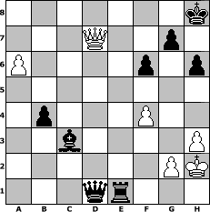 Partie-Notation im PGN-Format [Event "Fr"] [Site "www.mySchach.de"] [Date "2017.02.25"] [Round "1"] [White "Joschi"] [Black "UPS"] [ECO "B32"] [WhitemyELO "1567"] [BlackmyELO "1668"] [Result "0-1"] [TimeControl "10/2592000"] [WhiteDays "150"] [BlackDays "067"] [MySchachNr "107189"] 1. e4 c5 2. Nf3 Nc6 3. d4 cxd4 4. Nxd4 Nxd4 5. Qxd4 Qc7 6. Nc3 e6 7. Bd3 f6 8. Nb5 Qb8 9. O-O a6 10. Nc3 Ne7 11. Rd1 Nc6 12. Qe3 d6 13. Bd2 Be7 14. f4 Qc7 15. Kh1 O-O 16. Bc4 Kh8 17. Bb3 Na5 18. Ne2 Bd7 19. Bb4 Nxb3 20. Qxb3 a5 21. Ba3 b5 22. c3 Bc6 23. Qc2 Qb7 24. Ng3 Rfd8 25. b3 Rac8 26. Qe2 Qc7 27. Rac1 h6 28. Rd2 Qb7 29. Rcd1 b4 30. cxb4 axb4 31. Bb2 d5 32. exd5 Bxd5 33. Nf1 Bc5 34. Bd4 Re8 35. Ne3 Bxd4 36. Nxd5 exd5 37. Qf3 Bc3 38. Rxd5 Qe7 39. h3 Ra8 40. a4 Ra7 41. Qd3 Qf7 42. Rd8 Rae7 43. Rxe8+ Rxe8 44. a5 Qxb3 45. a6 Qa4 46. Qd7 Re1+ 47. Kh2 Qxd1 0-1 Stellungs-Notation im FEN-Format 7k/3Q2p1/P4p1p/8/1p3P2/2b4P/6PK/3qr3 - - - 0 48 Geschlagene Figuren Weiss: Geschlagene Figuren Schwarz: Klicken Sie auf eine geschlagene Figur um den gewünschten Zug darzustellen!
