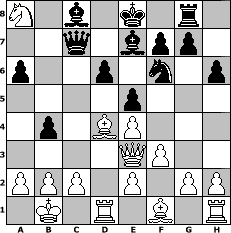 Partie-Notation im PGN-Format [Event "1. Haithabu-Spiele"] [Site "www.mySchach.de"] [Date "2008.08.15"] [Round "1"] [Board "1"] [White "BirdofPray1"] [Black "muetoe"] [ECO "B30"] [WhitemyELO "2233"] [BlackmyELO "1880"] [Result "1-0"] [TimeControl "10/2592000"] [WhiteDays "23"] [BlackDays "30"] [MySchachNr "47188"] 1. e4 c5 2. Nf3 Nc6 3. Nc3 d6 4. d4 cxd4 5. Nxd4 Nf6 6. Bg5 e6 7. Qd2 a6 8. O-O-O h6 9. Be3 Be7 10. f3 Nxd4 11. Bxd4 b5 12. Kb1 Rg8 13. Qe3 b4 14. Na4 Qc7 15. Nb6 e5 16. Nxa8 1-0 Stellungs-Notation im FEN-Format N1b1k1r1/2q1bpp1/p2p1n1p/4p3/1p1BP3/4QP2/PPP1P1PP/1K1R1B1R - q - 0 16 Geschlagene Figuren Weiss: Geschlagene Figuren Schwarz: Klicken Sie auf eine geschlagene Figur um den gewünschten Zug darzustellen!