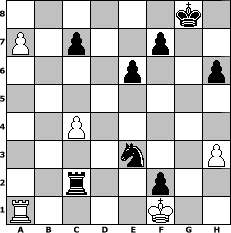 Partie-Notation im PGN-Format [Event "Sommersonne "] [Site "www.mySchach.de"] [Date "2016.05.14"] [Round "1"] [White "Gauss1233"] [Black "Attila89"] [ECO "A17"] [WhitemyELO "1475"] [BlackmyELO "1580"] [Result "0-1"] [TimeControl "10/2592000"] [WhiteDays "119"] [BlackDays "104"] [MySchachNr "103632"] 1. c4 Nf6 2. Nc3 e6 3. d4 Bb4 4. Bg5 O-O 5. a3 Bxc3+ 6. bxc3 h6 7. Bh4 d6 8. f3 b6 9. e4 Nbd7 10. e5 dxe5 11. dxe5 Nxe5 12. Qxd8 Rxd8 13. Bxf6 gxf6 14. Be2 Ba6 15. Nh3 Bxc4 16. Bxc4 Nxc4 17. Nf2 Rd2 18. O-O Ne3 19. Rfc1 Rad8 20. c4 f5 21. h3 f4 22. a4 Rb2 23. Re1 Rd2 24. Ng4 Nxg2 25. Reb1 Rbc2 26. Rc1 Nh4 27. Rxc2 Nxf3+ 28. Kf1 Rxc2 29. a5 Nh2+ 30. Ke1 Nxg4 31. axb6 f3 32. bxa7 f2+ 33. Kf1 Ne3# 0-1 Stellungs-Notation im FEN-Format 6k1/P1p2p2/4p2p/8/2P5/4n2P/2r2p2/R4K2 - - - 2 34 Geschlagene Figuren Weiss: Geschlagene Figuren Schwarz: Klicken Sie auf eine geschlagene Figur um den gewünschten Zug darzustellen!