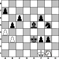 Partie-Notation im PGN-Format [Event "CM-Turnier-1-2014"] [Site "www.mySchach.de"] [Date "2014.01.11"] [Round "1"] [White "balesbenk1"] [Black "FrankB"] [ECO "C01"] [WhitemyELO "1509"] [BlackmyELO "1561"] [Result "0-1"] [TimeControl "10/2592000"] [WhiteDays "30"] [BlackDays "30"] [MySchachNr "92292"] 1. e4 e6 2. d4 d5 3. exd5 exd5 4. Nf3 Bd6 5. Nc3 c6 6. Bg5 f6 7. Be3 Bf5 8. Nh4 Bg6 9. Nxg6 hxg6 10. h3 Ne7 11. Bd3 Kf7 12. Qf3 Qd7 13. O-O-O Nf5 14. Bxf5 Qxf5 15. Qxf5 gxf5 16. f4 Na6 17. a3 Nc7 18. Rdg1 Ne6 19. g3 Rae8 20. Nd1 g6 21. h4 Ng7 22. Nf2 Rxe3 23. Kd2 Rhe8 24. Nd1 Rf3 25. Rh2 Nh5 26. Rf2 Rxg3 27. Rxg3 Nxg3 28. Kd3 Re4 29. Rf3 Nh5 30. Nf2 Rxf4 31. Rxf4 Bxf4 32. c4 Bg3 33. Nd1 Bxh4 34. b3 Nf4+ 35. Ke3 g5 36. Nc3 Ke6 37. Na4 b6 38. Nc3 Be1 39. Nd1 b5 40. cxd5+ Kxd5 41. Nb2 Ne6 42. Ke2 Bc3 43. Nd1 Kxd4 44. Nf2 g4 45. Kf1 g3 46. Nh3 f4 47. Ng1 Ke3 48. Kg2 Ng5 49. a4 Be5 50. Kf1 f3 0-1 Stellungs-Notation im FEN-Format 8/p7/2p2p2/1p2b1n1/P7/1P2kpp1/8/5KN1 - - - 0 51 Geschlagene Figuren Weiss: Geschlagene Figuren Schwarz: Klicken Sie auf eine geschlagene Figur um den gewünschten Zug darzustellen!