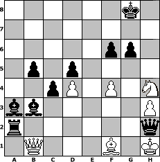 Partie-Notation im PGN-Format [Event "Es wird bald Sommer"] [Site "www.mySchach.de"] [Date "2015.05.12"] [Round "2"] [White "muellerh"] [Black "SEO1957"] [ECO "A03"] [WhitemyELO "1522"] [BlackmyELO "1553"] [Result "0-1"] [TimeControl "10/2592000"] [WhiteDays "19"] [BlackDays "27"] [MySchachNr "99244"] 1. f4 d5 2. Nf3 g6 3. e3 Bg7 4. Be2 Nf6 5. O-O O-O 6. d4 Nc6 7. c4 Ne4 8. Nbd2 Nxd2 9. Bxd2 Bf5 10. b3 a5 11. h3 e6 12. Ng5 h6 13. Nf3 b6 14. Be1 Nb4 15. Bf2 a4 16. bxa4 c5 17. cxd5 exd5 18. a3 Nc6 19. Rc1 c4 20. g4 Bd7 21. Bh4 Ne7 22. Kg2 Bxa4 23. Qd2 Re8 24. Qb4 Bb3 25. g5 Nf5 26. Bg3 Nxe3+ 27. Kf2 Nxf1 28. Bxf1 Bf8 29. Qd2 Rxa3 30. Kg1 Ra2 31. Qc3 hxg5 32. Nxg5 f6 33. Nf3 Ba3 34. Re1 Rxe1 35. Qxe1 b5 36. Nh4 Qe7 37. Qb1 Qe3+ 38. Bf2 Qxf2+ 39. Kh1 Qh2# 0-1 Stellungs-Notation im FEN-Format 6k1/8/5pp1/1p1p4/2pP1P1N/bb5P/r6q/1Q3B1K - - - 2 40 Geschlagene Figuren Weiss: Geschlagene Figuren Schwarz: Klicken Sie auf eine geschlagene Figur um den gewünschten Zug darzustellen!