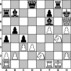 Partie-Notation im PGN-Format [Event "Schach dem Nikolaus V"] [Site "www.mySchach.de"] [Date "2015.12.03"] [Round "1"] [White "augustus"] [Black "gunni50"] [ECO "C55"] [WhitemyELO "1269"] [BlackmyELO "1244"] [Result "1-0"] [TimeControl "10/2592000"] [WhiteDays "120"] [BlackDays "111"] [MySchachNr "101459"] 1. e4 e5 2. Nf3 Nc6 3. Bc4 Nf6 4. O-O Bd6 5. c3 O-O 6. d3 a6 7. Bg5 b5 8. Bd5 Bb7 9. Bxc6 Bxc6 10. Nbd2 Be7 11. Nxe5 Bb7 12. Nb3 d6 13. Nf3 c5 14. Nh4 a5 15. Qd2 a4 16. Nc1 h6 17. Bxh6 Nh5 18. Nf5 Bf6 19. g4 gxh6 20. gxh5 Bg5 21. f4 Bf6 22. Qg2+ Kh8 23. Nxh6 Kh7 24. Ng4 Rg8 25. Ne2 Bc8 26. f5 d5 27. Kh1 dxe4 28. Qxe4 Ra7 29. Qf4 Bb7+ 30. Kg1 c4 31. Qh6# 1-0 Stellungs-Notation im FEN-Format 3q2r1/rb3p1k/5b1Q/1p3P1P/p1p3N1/2PP4/PP2N2P/R4RK1 - - - 1 31 Geschlagene Figuren Weiss: Geschlagene Figuren Schwarz: Klicken Sie auf eine geschlagene Figur um den gewünschten Zug darzustellen!