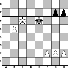 Partie-Notation im PGN-Format [Event "Sommerschach"] [Site "www.mySchach.de"] [Date "2018.05.26"] [Round "1"] [White "FrankB"] [Black "Gauss1233"] [ECO "D02"] [WhitemyELO "1641"] [BlackmyELO "1398"] [Result "1-0"] [TimeControl "10/2592000"] [WhiteDays "25"] [BlackDays "30"] [MySchachNr "112195"] 1. d4 d5 2. Nf3 Nc6 3. e3 Bg4 4. Be2 Nf6 5. O-O e6 6. a3 Bd6 7. Nbd2 e5 8. dxe5 Nxe5 9. Nxe5 Bxe2 10. Qxe2 Bxe5 11. Qb5+ c6 12. Qxb7 O-O 13. Qxc6 Rb8 14. Rb1 Rb6 15. Qa4 Qc7 16. Nf3 Nd7 17. Rd1 Qb7 18. Nxe5 Nxe5 19. b3 Rd8 20. c4 Ng6 21. c5 Ra6 22. Qd4 Qd7 23. Bb2 f6 24. Qd3 Rc6 25. b4 Ne5 26. Bxe5 fxe5 27. Rd2 Qf7 28. Rbd1 Rc7 29. Qb3 Rcd7 30. c6 Rd6 31. b5 d4 32. Qxf7+ Kxf7 33. exd4 exd4 34. Kf1 Ke6 35. c7 Rc8 36. Rxd4 Rxd4 37. Rxd4 Rxc7 38. Ke2 Rb7 39. a4 Rb6 40. Kd3 a6 41. Kc4 axb5+ 42. axb5 Ke5 43. Rd7 Kf6 44. Kc5 Re6 45. Rd6 Ke7 46. Rxe6+ Kxe6 47. Kc6 1-0 Stellungs-Notation im FEN-Format 8/6pp/2K1k3/1P6/8/8/5PPP/8 - - - 1 47 Geschlagene Figuren Weiss: Geschlagene Figuren Schwarz: Klicken Sie auf eine geschlagene Figur um den gewünschten Zug darzustellen!