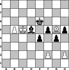 Partie-Notation im PGN-Format [Event "MNX2"] [Site "www.mySchach.de"] [Date "2015.04.19"] [Round "1"] [White "mnx"] [Black "Naunhofer"] [ECO "B20"] [WhitemyELO "1630"] [BlackmyELO "1611"] [Result "1/2-1/2"] [TimeControl "10/2592000"] [WhiteDays "30"] [BlackDays "29"] [MySchachNr "98988"] 1. e4 c5 2. d4 cxd4 3. Nf3 Nc6 4. Nxd4 e6 5. Nc3 a6 6. Be2 Be7 7. Bf4 d6 8. Nxc6 bxc6 9. e5 dxe5 10. Bxe5 Nf6 11. Qxd8+ Bxd8 12. O-O-O O-O 13. Bf3 Bb7 14. Na4 Nd5 15. c4 Nb6 16. Rxd8 Nxa4 17. Rxf8+ Rxf8 18. Bd6 Re8 19. c5 Rd8 20. Kc2 Rd7 21. Rd1 f6 22. b3 Nxc5 23. Bxc6 Bxc6 24. Bxc5 Rxd1 25. Kxd1 Bxg2 26. Kd2 e5 27. Kc3 Kf7 28. a4 Ke6 29. b4 g5 30. b5 axb5 31. axb5 Bd5 32. Kb4 e4 33. Bf8 h5 34. Kc5 f5 35. Bh6 g4 36. Bg5 1/2-1/2 Stellungs-Notation im FEN-Format 8/8/4k3/1PKb1pBp/4p1p1/8/5P1P/8 - - - 1 36 Geschlagene Figuren Weiss: Geschlagene Figuren Schwarz: Klicken Sie auf eine geschlagene Figur um den gewünschten Zug darzustellen!