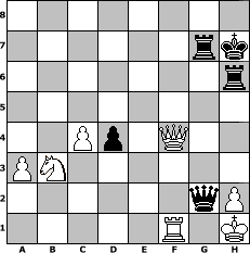 Partie-Notation im PGN-Format [Event "Februar 2017"] [Site "www.mySchach.de"] [Date "2017.02.05"] [Round "1"] [White "Schefsche"] [Black "hape50"] [ECO "C21"] [WhitemyELO "1371"] [BlackmyELO "1314"] [Result "0-1"] [TimeControl "10/1728000"] [WhiteDays "83"] [BlackDays "67"] [MySchachNr "106755"] 1. e4 e5 2. d4 exd4 3. Nf3 h6 4. Bc4 c6 5. Qxd4 Nf6 6. a3 d5 7. Qe5+ Be6 8. exd5 cxd5 9. Bb5+ Nfd7 10. Nd4 Nc6 11. Bxc6 bxc6 12. Qg3 Nf6 13. Nxc6 Qb6 14. Ne5 Ne4 15. Qf3 Bc5 16. O-O O-O 17. c3 g5 18. c4 Qd6 19. Ng4 Bxg4 20. Qxg4 f5 21. Qe2 Rae8 22. Qh5 d4 23. b4 Qe5 24. f4 Qg7 25. bxc5 Nxc5 26. fxg5 hxg5 27. Bb2 Re6 28. Nd2 Nd3 29. Bc1 Rff6 30. Nb3 Rh6 31. Qf3 Ne1 32. Qa8+ Kh7 33. Bxg5 Qxg5 34. Raxe1 Reg6 35. Rxf5 Qh4 36. Qxa7+ Rg7 37. Qb8 Qxe1+ 38. Rf1 Qe3+ 39. Kh1 Qe2 40. Qf4 Qxg2# 0-1 Stellungs-Notation im FEN-Format 8/6rk/7r/8/2Pp1Q2/PN6/6qP/5R1K - - - 0 41 Geschlagene Figuren Weiss: Geschlagene Figuren Schwarz: Klicken Sie auf eine geschlagene Figur um den gewünschten Zug darzustellen!