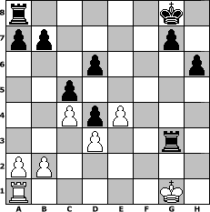 | Partie-Notation im PGN-Format [Event "Mail"] [Site "www.mySchach.de"] [Date "2012.05.01"] [Round "1"] [White "ndziemba"] [Black "fred521"] [ECO "C50"] [WhitemyELO "1446"] [BlackmyELO "1313"] [Result "0-1"] [TimeControl "10/864000"] [WhiteDays "10"] [BlackDays "10"] [MySchachNr "81395"] 1. e4 e5 2. Nf3 Nc6 3. Bc4 d6 4. d3 Be7 5. h4 Nf6 6. Ng5 O-O 7. O-O Bg4 8. f3 Bh5 9. Bxf7+ Bxf7 10. c4 Nd4 11. Be3 h6 12. Nxf7 Rxf7 13. Bxd4 exd4 14. Nd2 c5 15. Re1 Nh5 16. Nf1 Bxh4 17. Re2 Qg5 18. Qd2 Nf4 19. g3 Nxe2+ 20. Qxe2 Bxg3 21. Nxg3 Qxg3+ 22. Qg2 Rxf3 23. Qxg3 Rxg3+ 0-1 Stellungs-Notation im FEN-Format r5k1/pp4p1/3p3p/2p5/2PpP3/3P2r1/PP6/R5K1 - - - 0 24 Geschlagene Figuren Weiss:                              Geschlagene Figuren Schwarz:                               Klicken Sie auf eine geschlagene Figur um den gewünschten Zug darzustellen!
