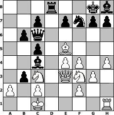 Partie-Notation im PGN-Format [Event "ZEPPELIN CLUB vs. FC960 (2014-01)"] [Site "www.mySchach.de"] [Date "2014.10.01"] [Round "1"] [Board "2"] [White "sabrina"] [Black "Schachfedi"] [Variant "Fischerrandom"] [SetUp "1"] [FEN "rnnqkrbb/pppppppp/8/8/8/8/PPPPPPPP/RNNQKRBB w KQkq - 0 1"] [WhitemyELO "1429"] [BlackmyELO "1837"] [Result "0-1"] [TimeControl "10/3456000"] [WhiteDays "00"] [BlackDays "35"] [MySchachNr "96123"] 1. f4 f5 2. g3 Nd6 3. Bd4 Nc6 4. Bxc6 dxc6 5. d3 Bf7 6. Nb3 O-O 7. Be5 Qd7 8. N1d2 b6 9. Nd4 c5 10. N4f3 Bd5 11. e4 fxe4 12. dxe4 Bc6 13. Qe2 a5 14. Qe3 Bb5 15. Rh1 Nf7 16. O-O-O Rad8 17. h4 a4 18. Nb1 Qc6 19. Rxd8 Rxd8 20. Nc3 Bc4 21. b3 axb3 0-1 Stellungs-Notation im FEN-Format 3r2kb/2p1pnpp/1pq5/2p1B3/2b1PP1P/1pN1QNP1/P1P2P2/2K4R - - - 0 22 Geschlagene Figuren Weiss: Geschlagene Figuren Schwarz: Klicken Sie auf eine geschlagene Figur um den gewünschten Zug darzustellen!