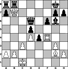 Partie-Notation im PGN-Format [Event "Herbst 2016"] [Site "www.mySchach.de"] [Date "2016.09.13"] [Round "1"] [White "beowulf"] [Black "miu"] [ECO "A23"] [WhitemyELO "1334"] [BlackmyELO "1527"] [Result "0-1"] [TimeControl "10/1728000"] [WhiteDays "45"] [BlackDays "54"] [MySchachNr "104916"] 1. c4 e5 2. Nc3 Nf6 3. g3 c6 4. Bg2 Bb4 5. Nf3 e4 6. Nd4 d5 7. cxd5 Bxc3 8. dxc3 cxd5 9. Bg5 Qb6 10. Qc2 Ng4 11. O-O-O Nxf2 12. e3 Nxh1 13. Bxh1 Bg4 14. Rf1 f6 15. Bf4 Nc6 16. Bd6 Nxd4 17. exd4 Qxd6 18. Bg2 O-O 19. Rf4 Bh5 20. Qb3 Bg6 21. Qxb7 Rfb8 0-1 Stellungs-Notation im FEN-Format rr4k1/pQ4pp/3q1pb1/3p4/3PpR2/2P3P1/PP4BP/2K5 - - - 1 22 Geschlagene Figuren Weiss: ![]() ![]() ![]() ![]() ![]() ![]() ![]() ![]() ![]() ![]() ![]() ![]() ![]() ![]() ![]() Geschlagene Figuren Schwarz: ![]() ![]() ![]() ![]() ![]() ![]() ![]() ![]() ![]() ![]() ![]() ![]() ![]() ![]() ![]() Klicken Sie auf eine geschlagene Figur um den gewünschten Zug darzustellen!