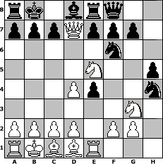 Partie-Notation im PGN-Format [Event "T960-S06"] [Site "www.mySchach.de"] [Date "2009.01.25"] [Round "1"] [White "Offi@ (adv.)"] [Black "deepewu"] [Variant "Fischerrandom"] [SetUp "1"] [FEN "rkbbrqnn/pppppppp/8/8/8/8/PPPPPPPP/RKBBRQNN w KQkq - 0 1"] [WhitemyELO "1500"] [BlackmyELO "1513"] [Result "1-0"] [TimeControl "10/3456000"] [WhiteDays "40"] [BlackDays "32"] [MySchachNr "52056"] 1. d4 d5 2. Nf3 Nf6 3. Ng3 Ng6 4. h4 h5 5. e4 dxe4 6. Ne5 Nxh4 7. Qb5 Bd7 8. Qxd7 1-0 Stellungs-Notation im FEN-Format rk1brq2/pppQppp1/5n2/4N2p/3Pp2n/6N1/PPPP1PP1/RKBBR3 - KQkq - 0 8 Geschlagene Figuren Weiss: Geschlagene Figuren Schwarz: Klicken Sie auf eine geschlagene Figur um den gewünschten Zug darzustellen!