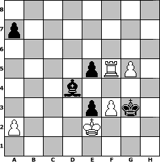 Partie-Notation im PGN-Format [Event "2. Frankenwaldturnier"] [Site "www.mySchach.de"] [Date "2007.03.01"] [Round "2"] [White "ujack1961"] [Black "Erwino123"] [ECO "C54"] [WhitemyELO "1882"] [BlackmyELO "1526"] [Result "1-0"] [TimeControl "10/864000"] [WhiteDays "50"] [BlackDays "44"] [MySchachNr "33067"] 1. e4 e5 2. Nf3 Nc6 3. Bc4 Bc5 4. c3 Nf6 5. O-O d6 6. d4 exd4 7. cxd4 Bb6 8. Nc3 O-O 9. d5 Ne5 10. Nxe5 dxe5 11. Bg5 Bd4 12. Bxf6 Qxf6 13. Qe2 c6 14. Rac1 Qg6 15. Qf3 Bd7 16. h3 b5 17. dxc6 Bxc6 18. Bxb5 Bxb5 19. Nxb5 Bxb2 20. Rc2 Bd4 21. Rfc1 f5 22. Qb3+ Qf7 23. Qxf7+ Rxf7 24. Nd6 fxe4 25. Nxf7 Kxf7 26. Rc7+ Kf8 27. Rc8+ Rxc8 28. Rxc8+ Kf7 29. Kf1 e3 30. f3 h6 31. Rc6 Ke7 32. Ke2 Kf7 33. g4 Ke7 34. h4 Kf7 35. Rc7+ Kg6 36. h5+ Kf6 37. Rb7 g6 38. Rh7 gxh5 39. Rxh6+ Kg5 40. Rxh5+ Kf4 41. Rf5+ Kg3 42. g5 1-0 Stellungs-Notation im FEN-Format 8/p7/8/4pRP1/3b4/4pPk1/P3K3/8 - - - 0 42 Geschlagene Figuren Weiss: Geschlagene Figuren Schwarz: Klicken Sie auf eine geschlagene Figur um den gewünschten Zug darzustellen!