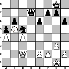 Partie-Notation im PGN-Format [Event "Thema-2016-01"] [Site "www.mySchach.de"] [Date "2016.02.11"] [Round "1"] [White "faustballer"] [Black "Seneca"] [ECO "A12"] [WhitemyELO "1490"] [BlackmyELO "1480"] [Result "1/2-1/2"] [TimeControl "10/2592000"] [WhiteDays "30"] [BlackDays "27"] [MySchachNr "102477"] 1. c4 c6 2. Nf3 d5 3. b3 dxc4 4. bxc4 e6 5. Bb2 Nf6 6. g3 Be7 7. Bg2 Nbd7 8. O-O O-O 9. Nc3 Nb6 10. d3 Nbd7 11. a4 Re8 12. d4 Qc7 13. Bc1 Bb4 14. Bd2 a5 15. Na2 Bxd2 16. Qxd2 b6 17. Nc3 Ba6 18. Qa2 h6 19. Rfe1 Rab8 20. Nd2 Bb7 21. Nce4 Nxe4 22. Bxe4 c5 23. Bxb7 Rxb7 24. Nf3 cxd4 25. Nxd4 Rc8 26. Rac1 Nc5 27. Nb5 Qe7 28. Red1 Rd8 29. Nd4 Qe8 30. Nb5 Rxd1+ 31. Rxd1 Rd7 32. Qc2 Rxd1+ 33. Qxd1 Qd7 34. Qc2 1/2-1/2 Stellungs-Notation im FEN-Format 6k1/3q1pp1/1p2p2p/pNn5/P1P5/6P1/2Q1PP1P/6K1 - - - 2 34 Geschlagene Figuren Weiss: Geschlagene Figuren Schwarz: Klicken Sie auf eine geschlagene Figur um den gewünschten Zug darzustellen!