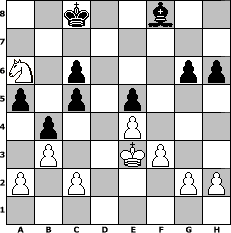 Partie-Notation im PGN-Format [Event "Chess960 leicht fortgeschritten (II)"] [Site "www.mySchach.de"] [Date "2008.03.01"] [Round "2"] [White "thw"] [Black "rakl"] [Variant "Fischerrandom"] [SetUp "1"] [FEN "qrkrbbnn/pppppppp/8/8/8/8/PPPPPPPP/QRKRBBNN w KQkq - 0 1"] [WhitemyELO "1510"] [BlackmyELO "1630"] [Result "0-1"] [TimeControl "10/1728000"] [WhiteDays "80"] [BlackDays "73"] [MySchachNr "43026"] 1. Ng3 e5 2. Nf3 Ng6 3. e4 N8e7 4. b3 f6 5. d4 d6 6. dxe5 Nxe5 7. Nxe5 fxe5 8. Ba5 Nc6 9. Qc3 Nxa5 10. Qxa5 Bc6 11. Bc4 Re8 12. f3 O-O-O 13. O-O g6 14. Ne2 a6 15. Nc3 Qa7+ 16. Kh1 Qc5 17. Qxc5 dxc5 18. Rbd1 b5 19. Bf7 Re7 20. Rxd8+ Kxd8 21. Rd1+ Rd7 22. Rxd7+ Kxd7 23. Bd5 Bxd5 24. Nxd5 h6 25. Kg1 c6 26. Nf6+ Ke6 27. Ne8 a5 28. Kf2 Ke7 29. Nc7 b4 30. Na6 Kd8 31. Ke3 Kc8 0-1 Stellungs-Notation im FEN-Format 2k2b2/8/N1p3pp/p1p1p3/1p2P3/1P2KP2/P1P3PP/8 - - - 4 32 Geschlagene Figuren Weiss: Geschlagene Figuren Schwarz: Klicken Sie auf eine geschlagene Figur um den gewünschten Zug darzustellen!