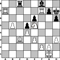 Partie-Notation im PGN-Format [Event "Mannschaftsturnier der letzen Mohikan3er"] [Site "www.mySchach.de"] [Date "2018.06.01"] [Round "1"] [White "martinus"] [Black "hape50"] [ECO "A00"] [WhitemyELO "1711"] [BlackmyELO "1283"] [Result "1-0"] [TimeControl "10/2592000"] [WhiteDays "84"] [BlackDays "81"] [MySchachNr "112321"] 1. b4 d5 2. Bb2 b5 3. e3 c6 4. Nf3 h6 5. d4 Nf6 6. Bd3 Bg4 7. h3 Be6 8. O-O Na6 9. c3 Qd7 10. Ne5 Qc7 11. a4 Bd7 12. axb5 Nb8 13. bxc6 Nxc6 14. Nxd7 Qxd7 15. Na3 e6 16. Bb5 Bd6 17. Qa4 Rc8 18. Bxc6 Rxc6 19. Nb5 O-O 20. Nxa7 Ra8 21. Qxc6 Qxc6 22. Nxc6 Rc8 23. b5 Ne4 24. Ra7 Nd2 25. Rfa1 Kh7 26. Rxf7 Ne4 27. Raa7 Bf8 28. Ne5 Nxc3 29. Bxc3 1-0 Stellungs-Notation im FEN-Format 2r2b2/R4Rpk/4p2p/1P1pN3/3P4/2B1P2P/5PP1/6K1 - - - 0 29 Geschlagene Figuren Weiss: Geschlagene Figuren Schwarz: Klicken Sie auf eine geschlagene Figur um den gewünschten Zug darzustellen!