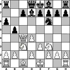 Partie-Notation im PGN-Format [Event "Zug um Zug gegen Fr"] [Site "www.mySchach.de"] [Date "2012.03.12"] [Round "1"] [White "Aliasalias"] [Black "Ziegert"] [ECO "D20"] [WhitemyELO "1574"] [BlackmyELO "1533"] [Result "0-1"] [TimeControl "10/2592000"] [WhiteDays "00"] [BlackDays "02"] [MySchachNr "80557"] 1. d4 d5 2. c4 dxc4 3. Qa4+ Nc6 4. e3 Bd7 5. Bxc4 Ne5 6. Qb3 Nxc4 7. Qxc4 a6 8. Nc3 Nf6 9. Nf3 b5 0-1 Stellungs-Notation im FEN-Format r2qkb1r/2pbpppp/p4n2/1p6/2QP4/2N1PN2/PP1P1PPP/R1B1K2R - KQkq - 0 10 Geschlagene Figuren Weiss: Geschlagene Figuren Schwarz: Klicken Sie auf eine geschlagene Figur um den gewünschten Zug darzustellen!
