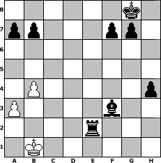 Partie-Notation im PGN-Format [Event "Zum Vatertag"] [Site "www.mySchach.de"] [Date "2017.05.27"] [Round "1"] [White "alpacino"] [Black "Grubengeist"] [ECO "D02"] [WhitemyELO "1335"] [BlackmyELO "1985"] [Result "0-1"] [TimeControl "10/2592000"] [WhiteDays "100"] [BlackDays "110"] [MySchachNr "108369"] 1. d4 d5 2. Nf3 Nf6 3. Nc3 Nc6 4. h3 e6 5. Bd2 Be7 6. e3 O-O 7. Bd3 h6 8. Qe2 Nb4 9. Ne5 Nd7 10. Nxd7 Bxd7 11. e4 Nxd3+ 12. Qxd3 dxe4 13. Nxe4 Bc6 14. b3 e5 15. c3 exd4 16. cxd4 Qd5 17. Nc3 Qxg2 18. Qf1 Qxh1 19. Qxh1 Bxh1 20. O-O-O Bf3 21. Re1 Rfe8 22. Kb1 Rad8 23. Nb5 Bg5 24. Rc1 Bxd2 25. Rxc7 Re2 26. Nc3 Bxc3 27. Rxc3 Rxf2 28. h4 Rxd4 29. Kc1 Rxh4 30. Rc2 Rxc2+ 31. Kxc2 Rh2+ 32. Kb1 Re2 33. a3 h5 34. b4 h4 0-1 Stellungs-Notation im FEN-Format 6k1/pp3pp1/8/8/1P5p/P4b2/4r3/1K6 - - - 0 35 Geschlagene Figuren Weiss: Geschlagene Figuren Schwarz: Klicken Sie auf eine geschlagene Figur um den gewünschten Zug darzustellen!