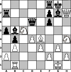Partie-Notation im PGN-Format [Event "CHESSMASTERS"] [Site "www.mySchach.de"] [Date "2005.08.13"] [Round "1"] [White "Falcor"] [Black "Fuffy"] [ECO "D06"] [WhitemyELO "1473"] [BlackmyELO "1238"] [Result "1-0"] [TimeControl "10/2592000"] [WhiteDays "88"] [BlackDays "90"] [MySchachNr "16168"] 1. d4 d5 2. c4 Nf6 3. Bg5 e6 4. Nc3 c5 5. Nf3 Qd6 6. Bxf6 gxf6 7. e3 a6 8. g3 Nd7 9. Qd3 Nb6 10. cxd5 exd5 11. Bg2 Nc4 12. Rb1 b5 13. Nh4 b4 14. Na4 Bd7 15. Nxc5 Bb5 16. Qf5 Bg7 17. Bxd5 Ra7 18. O-O Nd2 19. Rfe1 Nxb1 20. Rxb1 O-O 21. Bg2 Bc4 22. b3 Bb5 23. Be4 a5 24. Qxh7# 1-0 Stellungs-Notation im FEN-Format 5rk1/r4pbQ/3q1p2/pbN5/1p1PB2N/1P2P1P1/P4P1P/1R4K1 - - - 0 24 Geschlagene Figuren Weiss: Geschlagene Figuren Schwarz: Klicken Sie auf eine geschlagene Figur um den gewünschten Zug darzustellen!