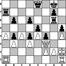 Partie-Notation im PGN-Format [Event "2. Chess960/1"] [Site "www.mySchach.de"] [Date "2008.03.15"] [Round "1"] [White "Knoeppel@"] [Black "Stabiloboss"] [Variant "Fischerrandom"] [SetUp "1"] [FEN "rqnbbknr/pppppppp/8/8/8/8/PPPPPPPP/RQNBBKNR w KQkq - 0 1"] [WhitemyELO "1500"] [BlackmyELO "1524"] [Result "1/2-1/2"] [TimeControl "10/3456000"] [WhiteDays "117"] [BlackDays "063"] [MySchachNr "43401"] 1. Nf3 c5 2. d3 a5 3. e4 e5 4. c4 Nge7 5. Bd2 d6 6. Nce2 O-O 7. O-O Bd7 8. Nc3 f5 9. Be2 f4 10. a3 Nc6 11. b3 Nd4 12. Nxd4 cxd4 13. Nb5 Rf6 14. Qd1 Na7 15. Nxa7 Rxa7 16. Bg4 Qc8 17. Bxd7 Qxd7 18. Qf3 Rg6 19. a4 Ra8 20. Rfb1 Bb6 21. Kh1 Rf6 22. h3 Rh6 23. Kh2 Bd8 24. Kg1 Rg6 25. Rb2 Ra7 26. Rbb1 Bb6 27. Kh2 Rh6 28. Kg1 Rf6 29. Kh2 Ra8 30. Kh1 Qc6 31. Rb2 Bc5 32. Rab1 b6 33. Ra2 Rg6 34. Raa1 Qd7 35. Kh2 Rh6 36. Kg1 Rf6 37. Kh2 Qe8 38. Rh1 Ra7 39. h4 h5 40. Rhg1 Bb4 41. Bxb4 axb4 42. Rh1 Rg6 1/2-1/2 Stellungs-Notation im FEN-Format 4q1k1/r5p1/1p1p2r1/4p2p/PpPpPp1P/1P1P1Q2/5PPK/R6R - - - 2 43 Geschlagene Figuren Weiss: Geschlagene Figuren Schwarz: Klicken Sie auf eine geschlagene Figur um den gewünschten Zug darzustellen!