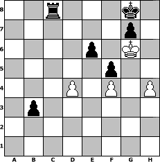 Partie-Notation im PGN-Format [Event "unter uns Nr. 17"] [Site "www.mySchach.de"] [Date "2014.02.13"] [Round "1"] [White "borsti"] [Black "Kyros537"] [ECO "A03"] [WhitemyELO "1263"] [BlackmyELO "1451"] [Result "0-1"] [TimeControl "10/864000"] [WhiteDays "50"] [BlackDays "50"] [MySchachNr "92914"] 1. f4 d5 2. d4 Nf6 3. Nc3 Nc6 4. e3 e6 5. Bb5 Bd7 6. Bxc6 Bxc6 7. Nf3 Bb4 8. Bd2 a5 9. Ne2 Ne4 10. Bxb4 axb4 11. a3 bxa3 12. Rxa3 O-O 13. O-O Qe7 14. g4 Rxa3 15. bxa3 Qxa3 16. Qc1 Qa6 17. Re1 Bb5 18. Ng3 Re8 19. Nxe4 dxe4 20. Ng5 Qc6 21. Qb2 Ba6 22. c3 h6 23. Nh3 f5 24. g5 Qc4 25. Nf2 hxg5 26. Rb1 gxf4 27. exf4 e3 28. Nh3 Qd3 29. Re1 e2 30. Rxe2 Qxh3 31. Rf2 Qg4+ 32. Kh1 Bd3 33. Rg2 Be4 34. Kg1 Bxg2 35. Qxg2 Qxg2+ 36. Kxg2 c6 37. Kg3 b5 38. Kh4 Rc8 39. Kg5 c5 40. Kg6 cxd4 41. cxd4 b4 42. h4 b3 0-1 Stellungs-Notation im FEN-Format 2r3k1/6p1/4p1K1/5p2/3P1P1P/1p6/8/8 - - - 0 43 Geschlagene Figuren Weiss: Geschlagene Figuren Schwarz: Klicken Sie auf eine geschlagene Figur um den gewünschten Zug darzustellen!