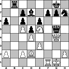 Partie-Notation im PGN-Format [Event "Advents Special"] [Site "www.mySchach.de"] [Date "2016.11.24"] [Round "1"] [White "augustus"] [Black "Caligula"] [ECO "D00"] [WhitemyELO "1173"] [BlackmyELO "1332"] [Result "1-0"] [TimeControl "10/1728000"] [WhiteDays "20"] [BlackDays "00"] [MySchachNr "105766"] 1. d4 d5 2. e3 Nf6 3. Be2 Nc6 4. Bb5 Bd7 5. Nc3 e6 6. Nf3 Bb4 7. Ne5 O-O 8. Bxc6 bxc6 9. O-O Bxc3 10. bxc3 Ne4 11. Bd2 Nf6 12. Rb1 Qe7 13. c4 Rab8 14. Rxb8 Rxb8 15. c5 a6 16. f4 h6 17. g4 Nh7 18. g5 hxg5 19. fxg5 Qxg5+ 20. Qg4 1-0 Stellungs-Notation im FEN-Format 1r4k1/2pb1ppn/p1p1p3/2PpN1q1/3P2Q1/4P3/P1PB3P/5RK1 - - - 1 20 Geschlagene Figuren Weiss: Geschlagene Figuren Schwarz: Klicken Sie auf eine geschlagene Figur um den gewünschten Zug darzustellen!